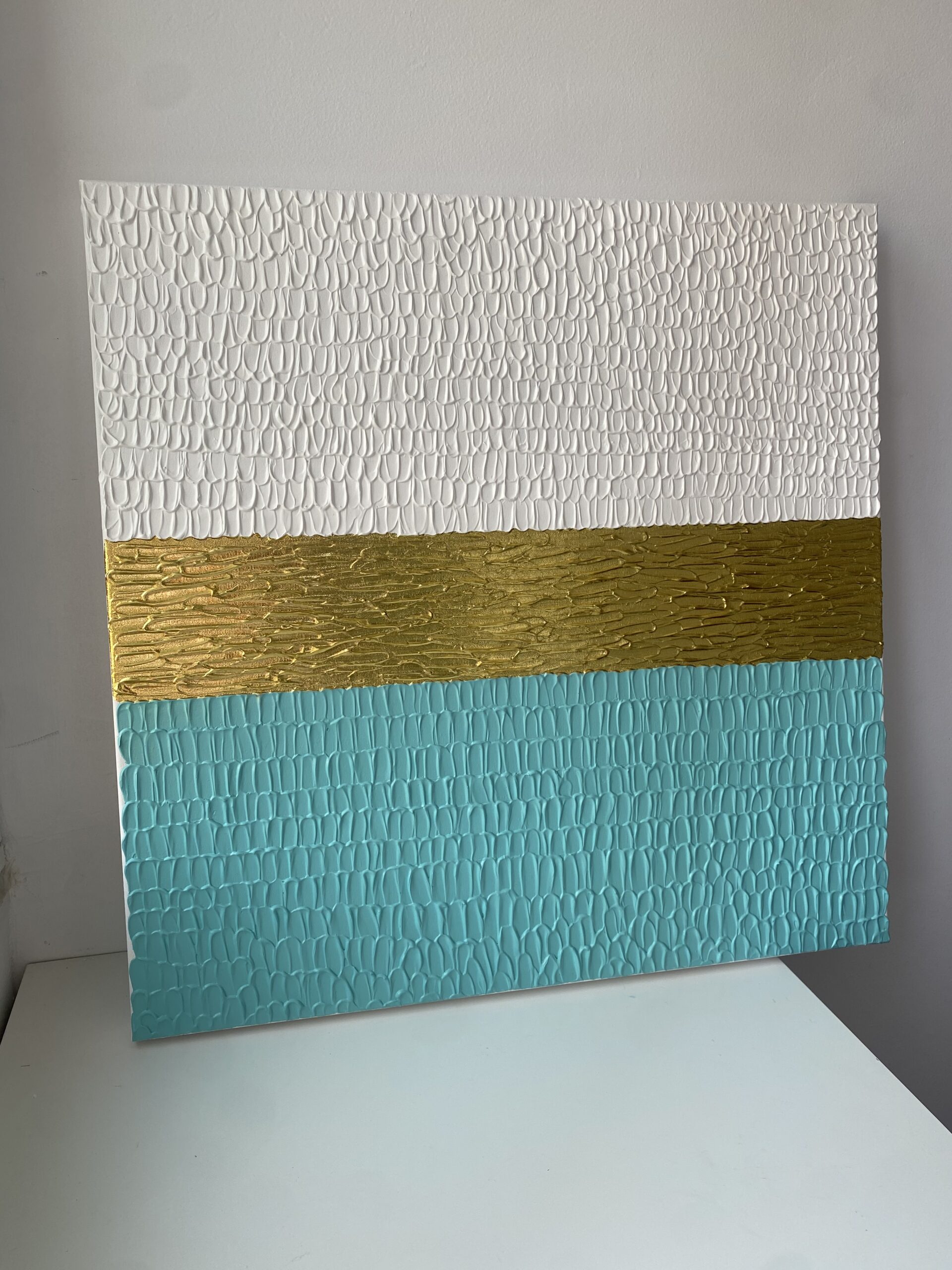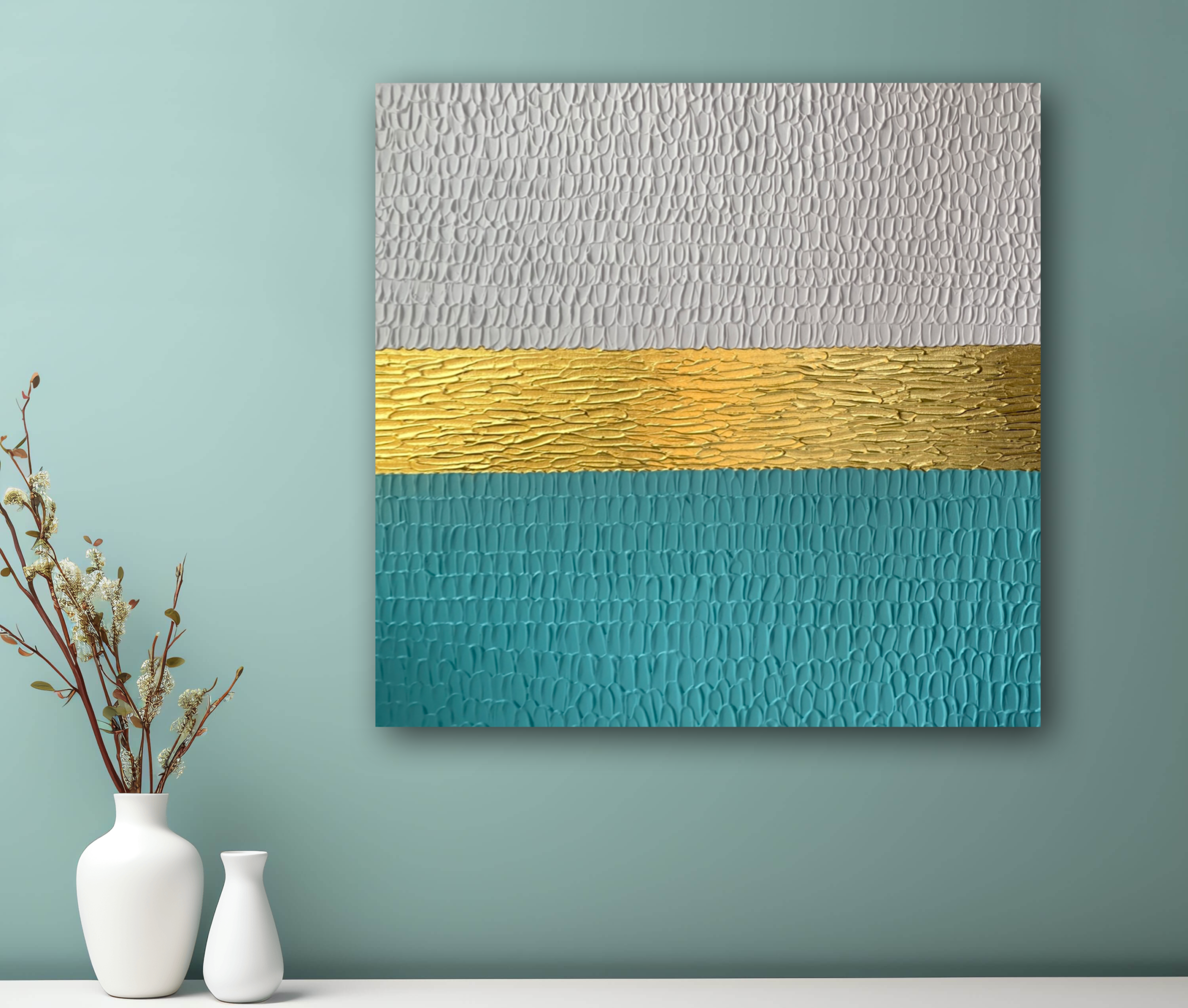 Tres franjas de textura pura: blanco nacar, oro reluciente y aguamarina profunda. Una obra tactil que evoca la calma de la orilla del mar, donde el cielo, la arena y el agua se fusionan en un horizonte eterno.