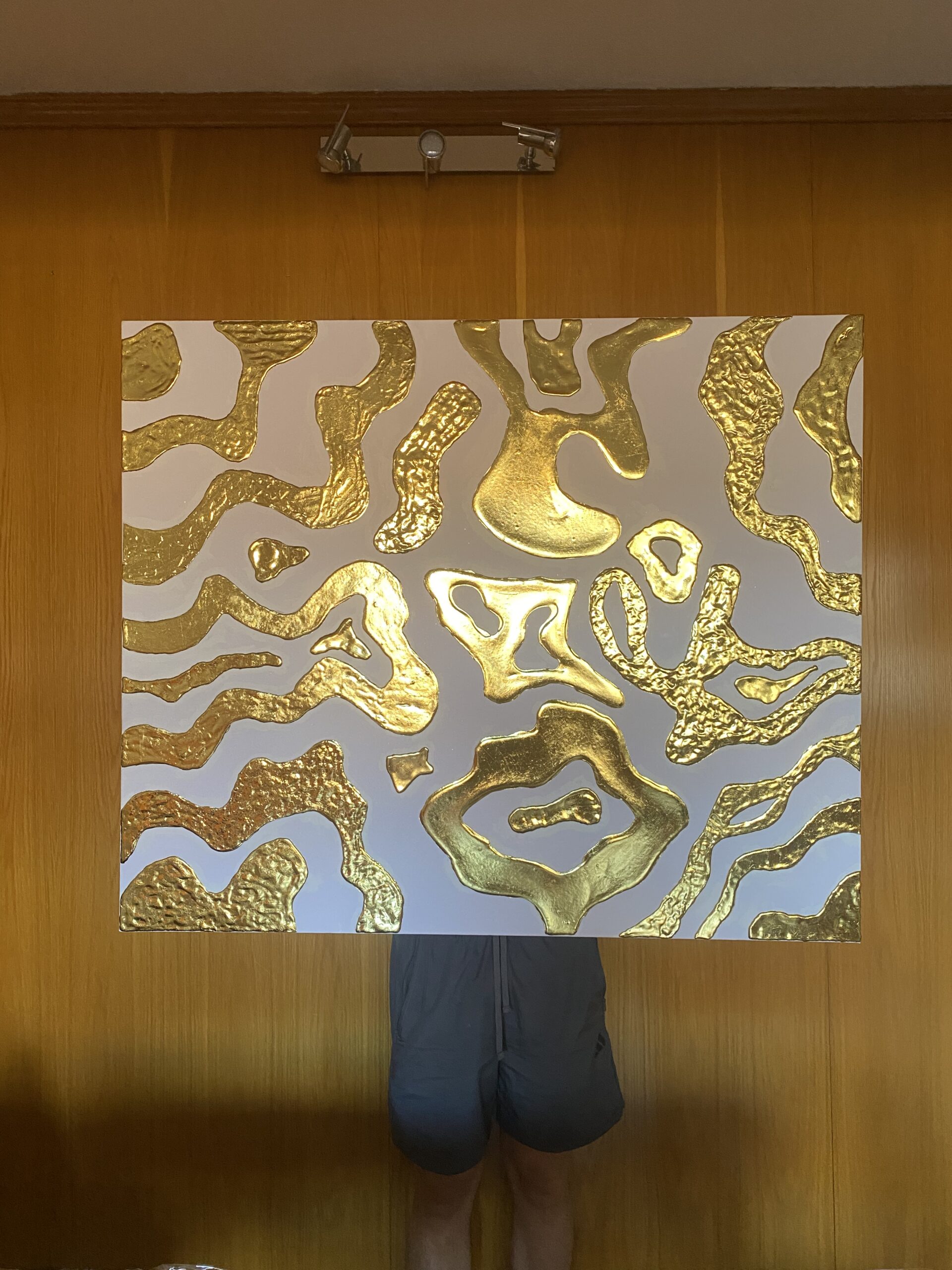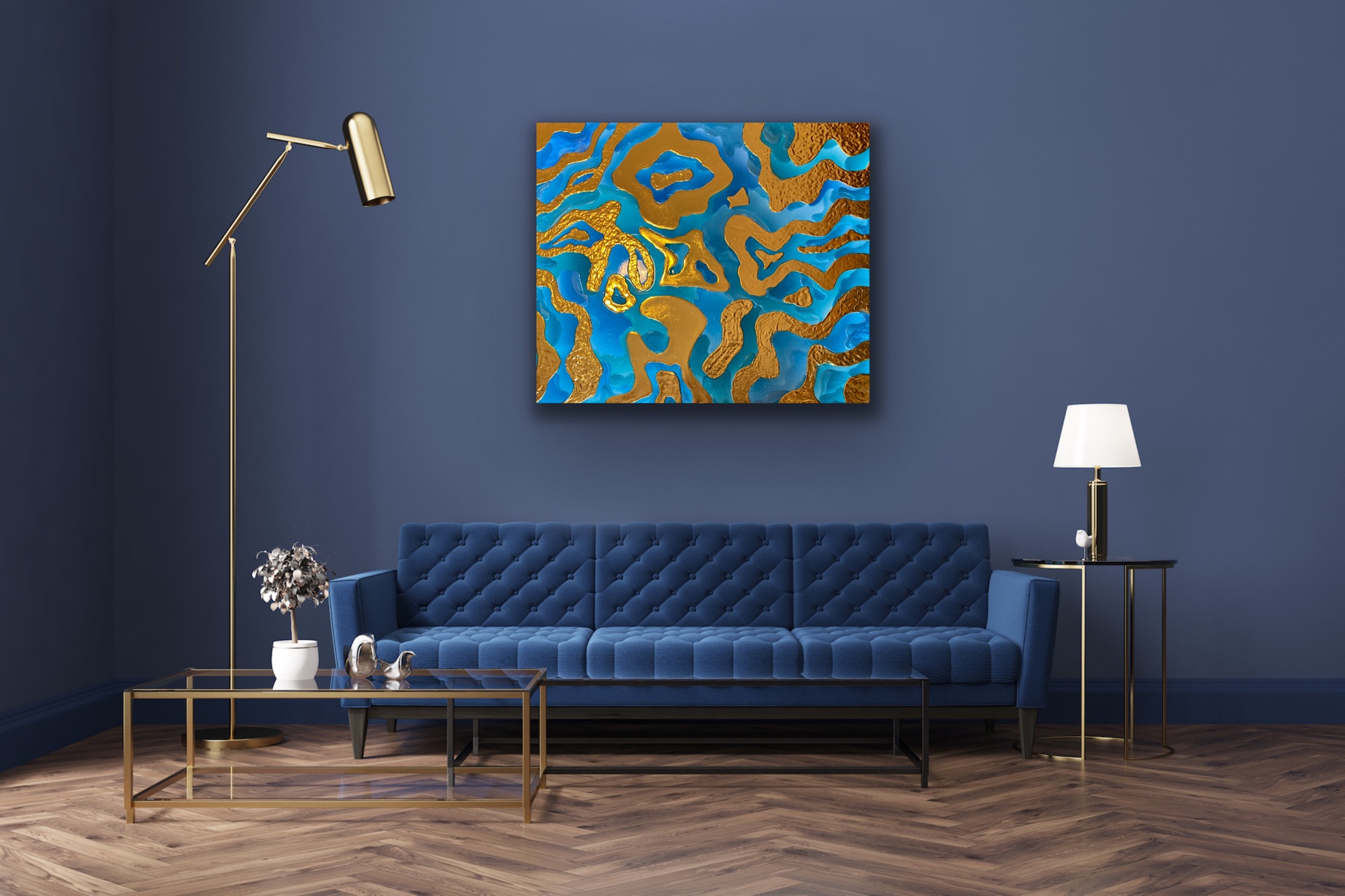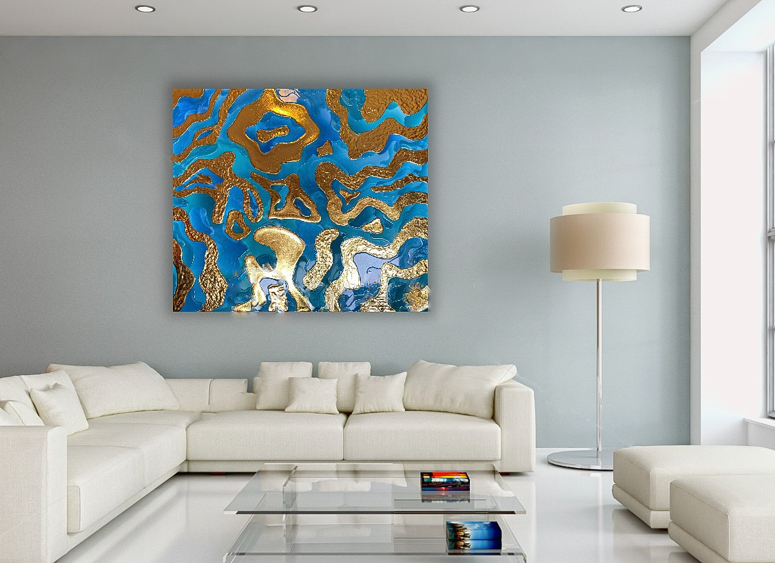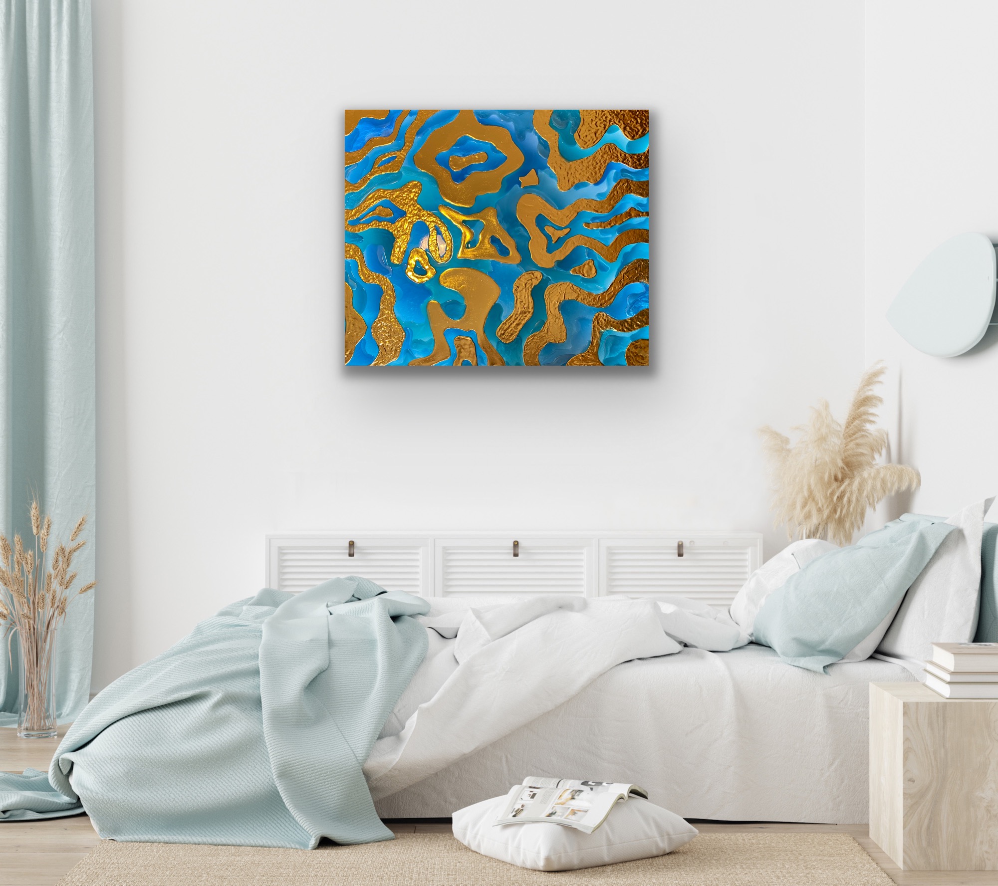 Cauces dorados fluyen sobre un fondo de resina en tonos azules y turquesa, como una vista aerea de marismas banadas por el sol. La alquimia del oro y el agua crea un paisaje irrepetible y vibrante.
