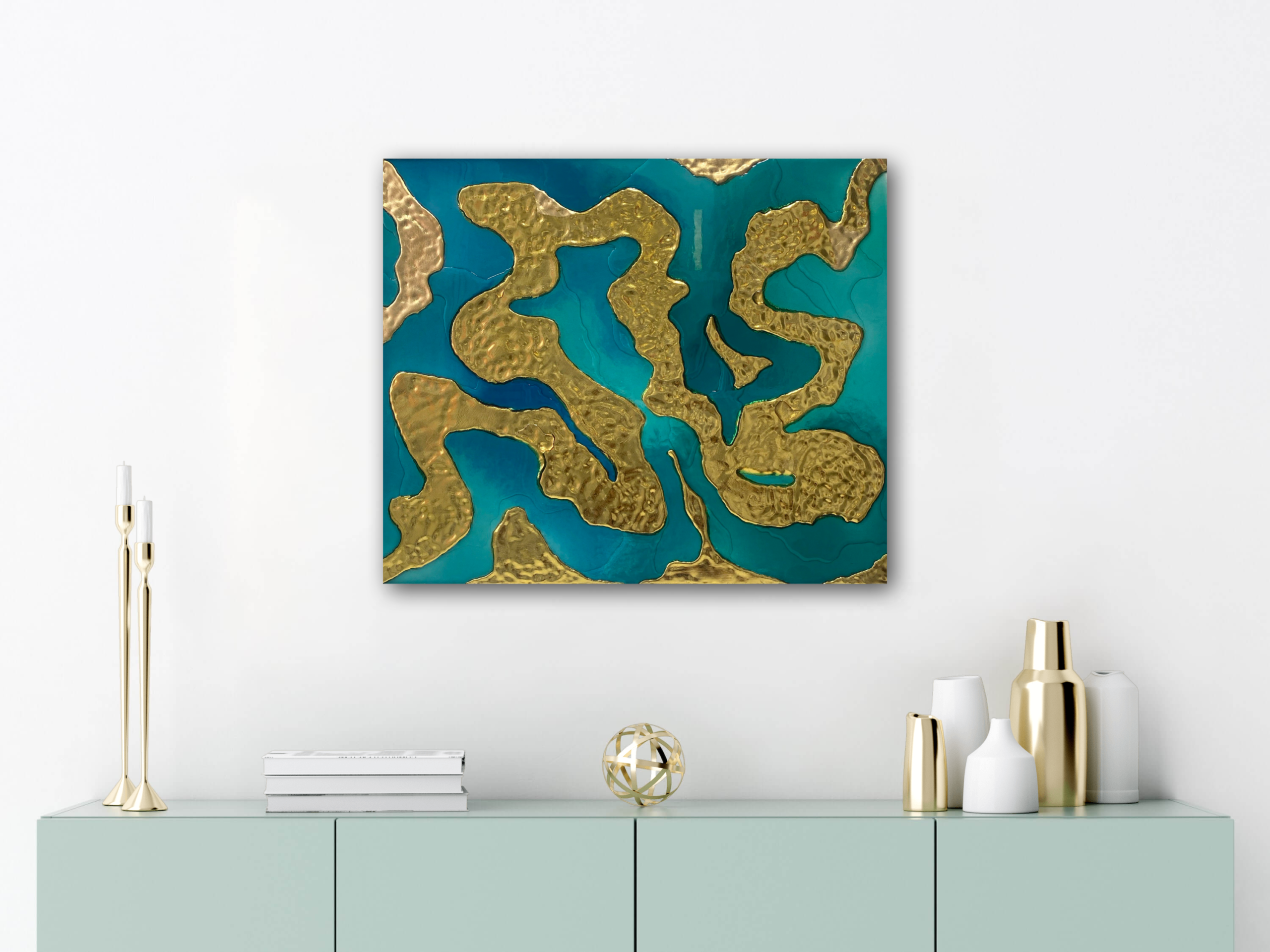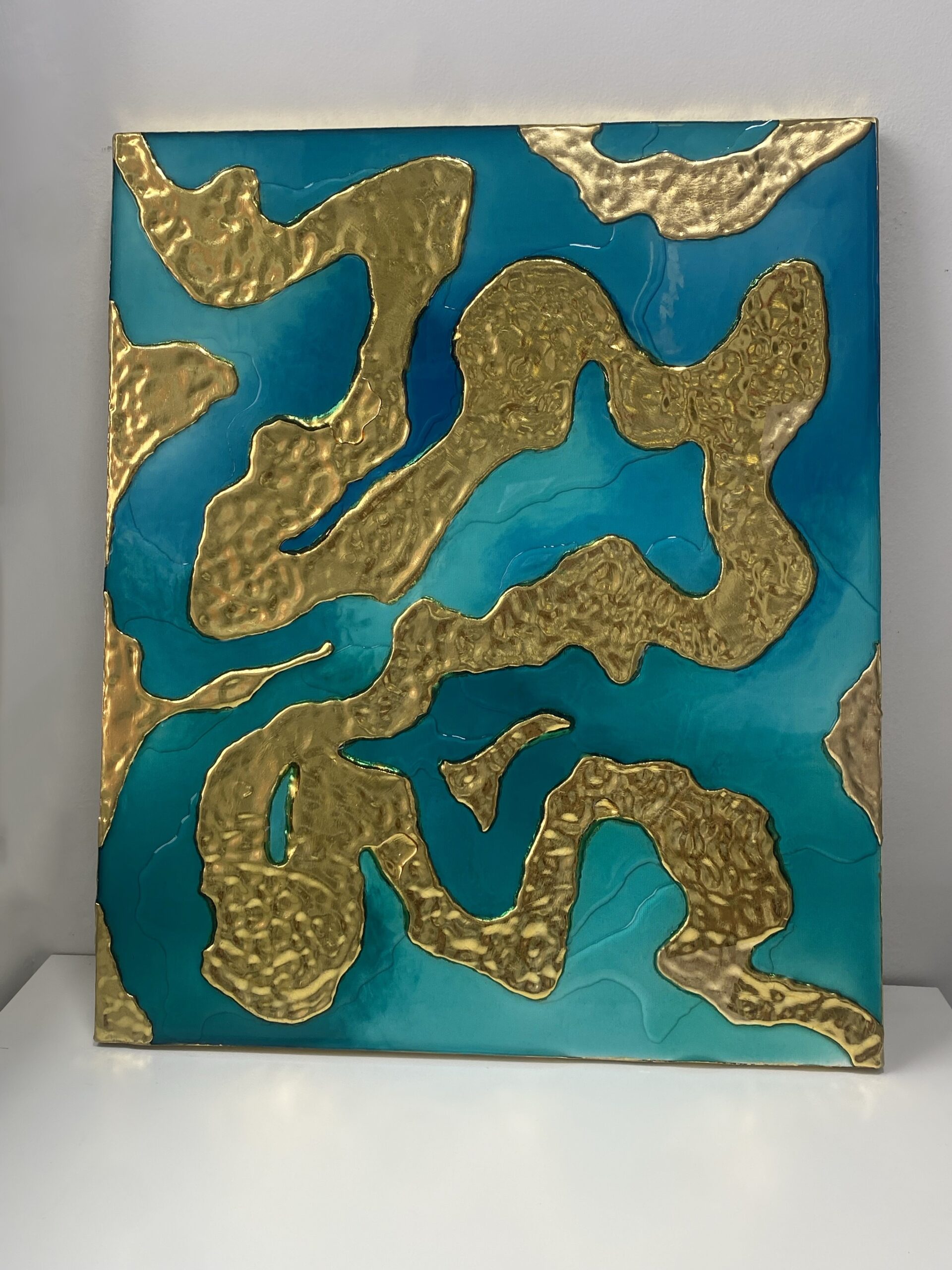 Formas organicas de pan de oro emergen desde un oceano de resina acrilica en tonos turquesa y azul. Una pieza que captura el instante magico en que la luz del amanecer toca la superficie del mar.