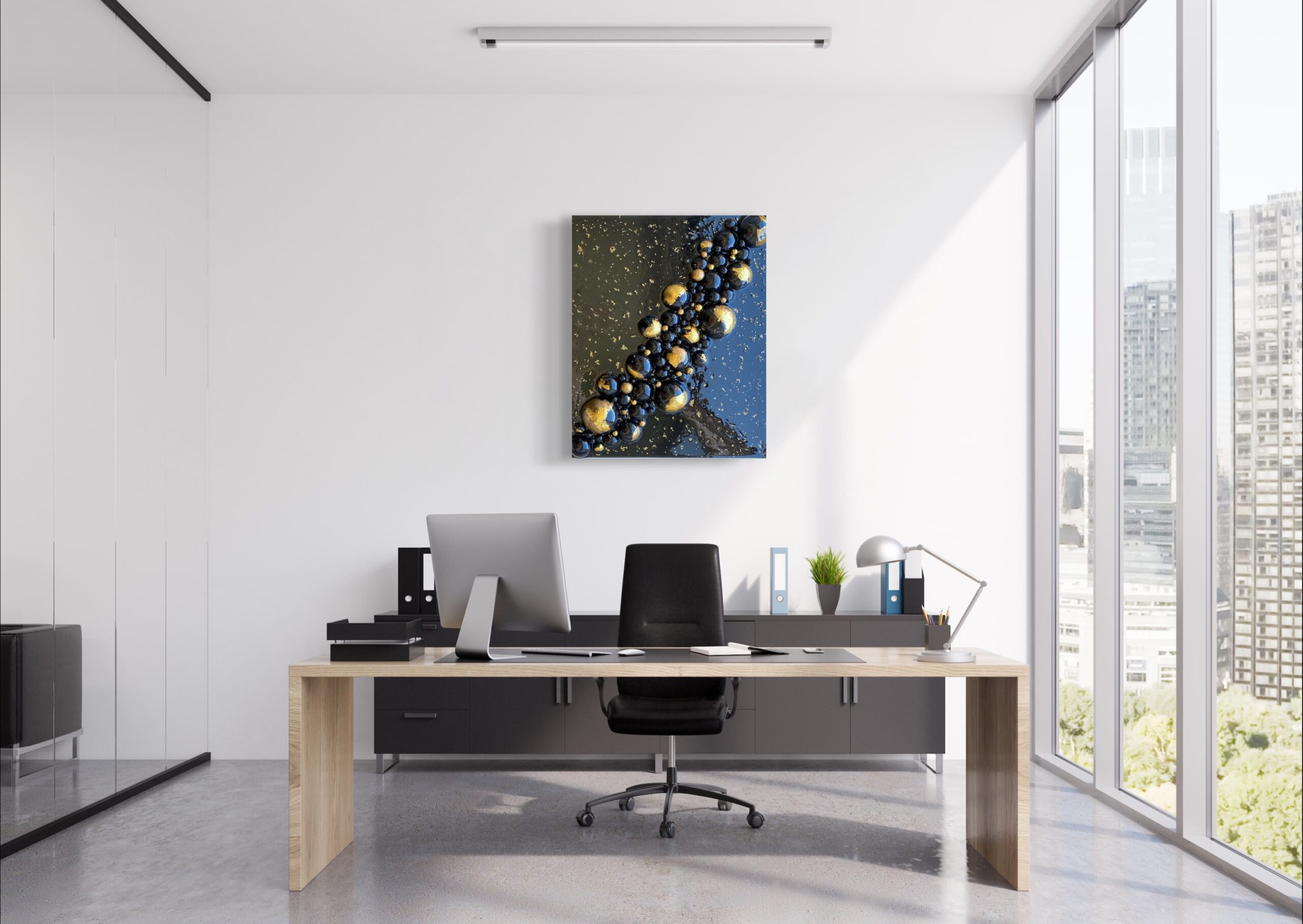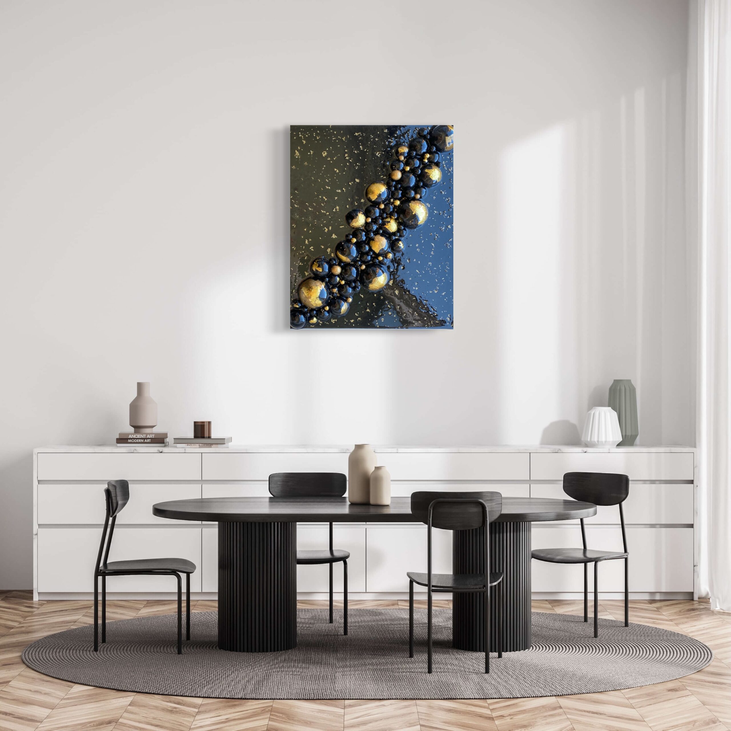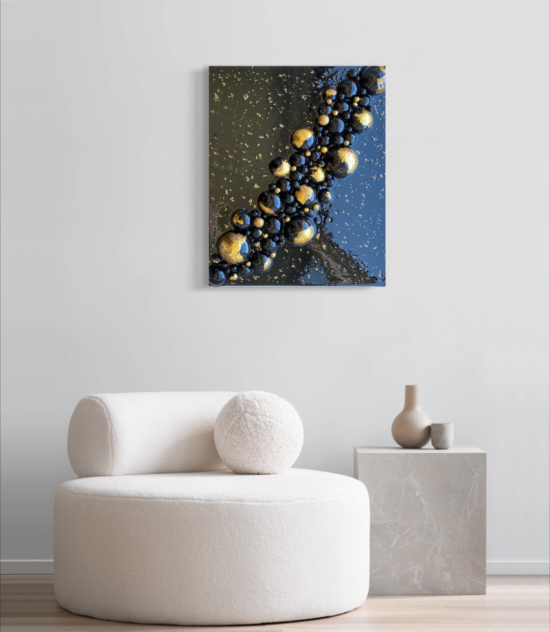 Esferas de polimero en negro lacado danzan en diagonal sobre un fondo oscuro salpicado de pan de oro, como burbujas de champagne que suben hacia la superficie en una noche de celebracion sin fin.