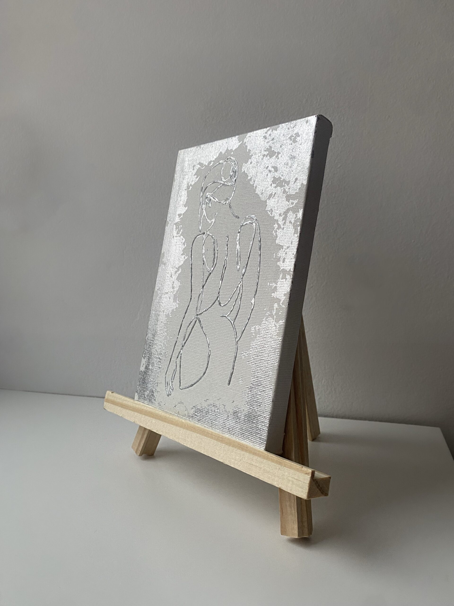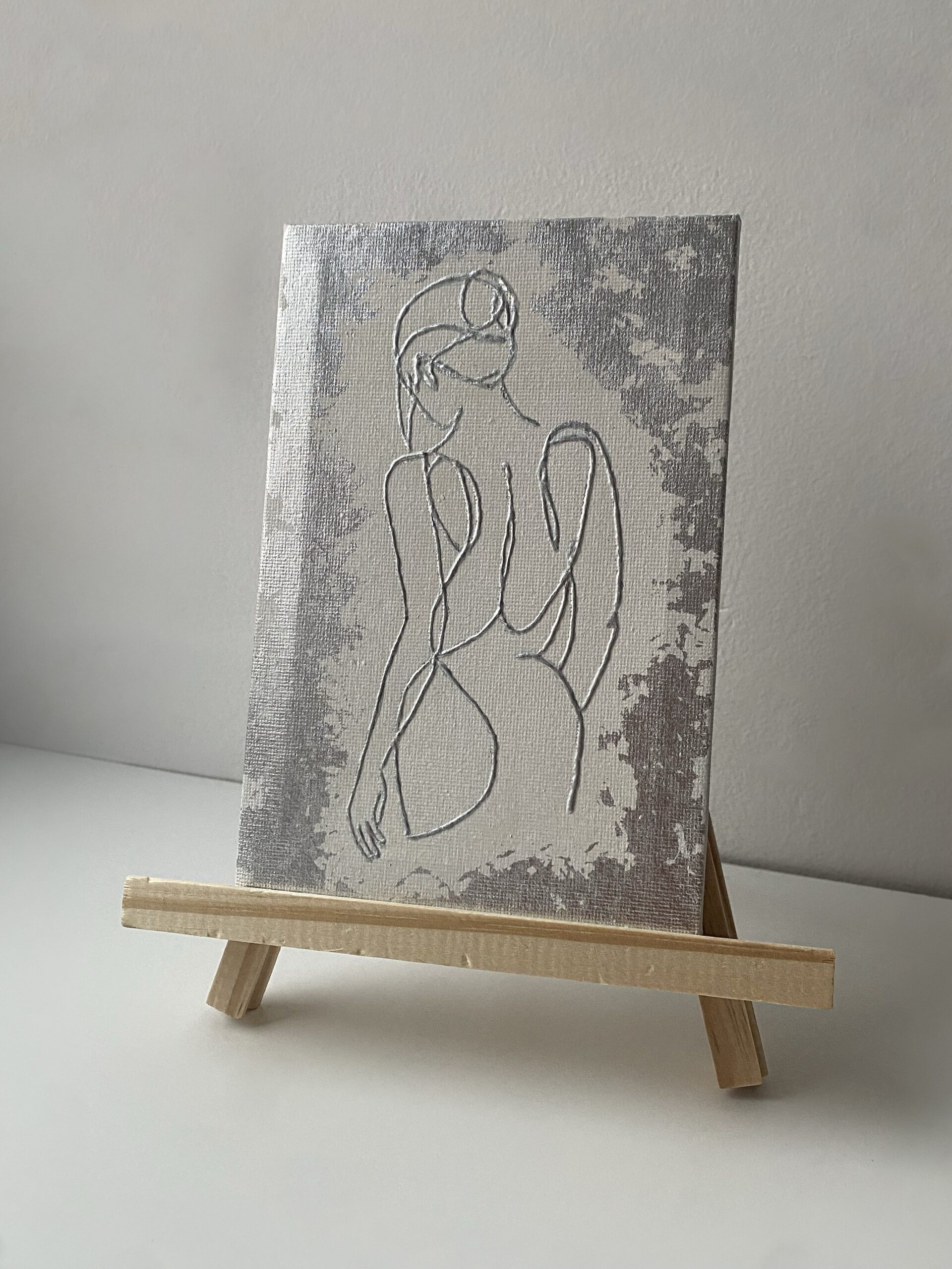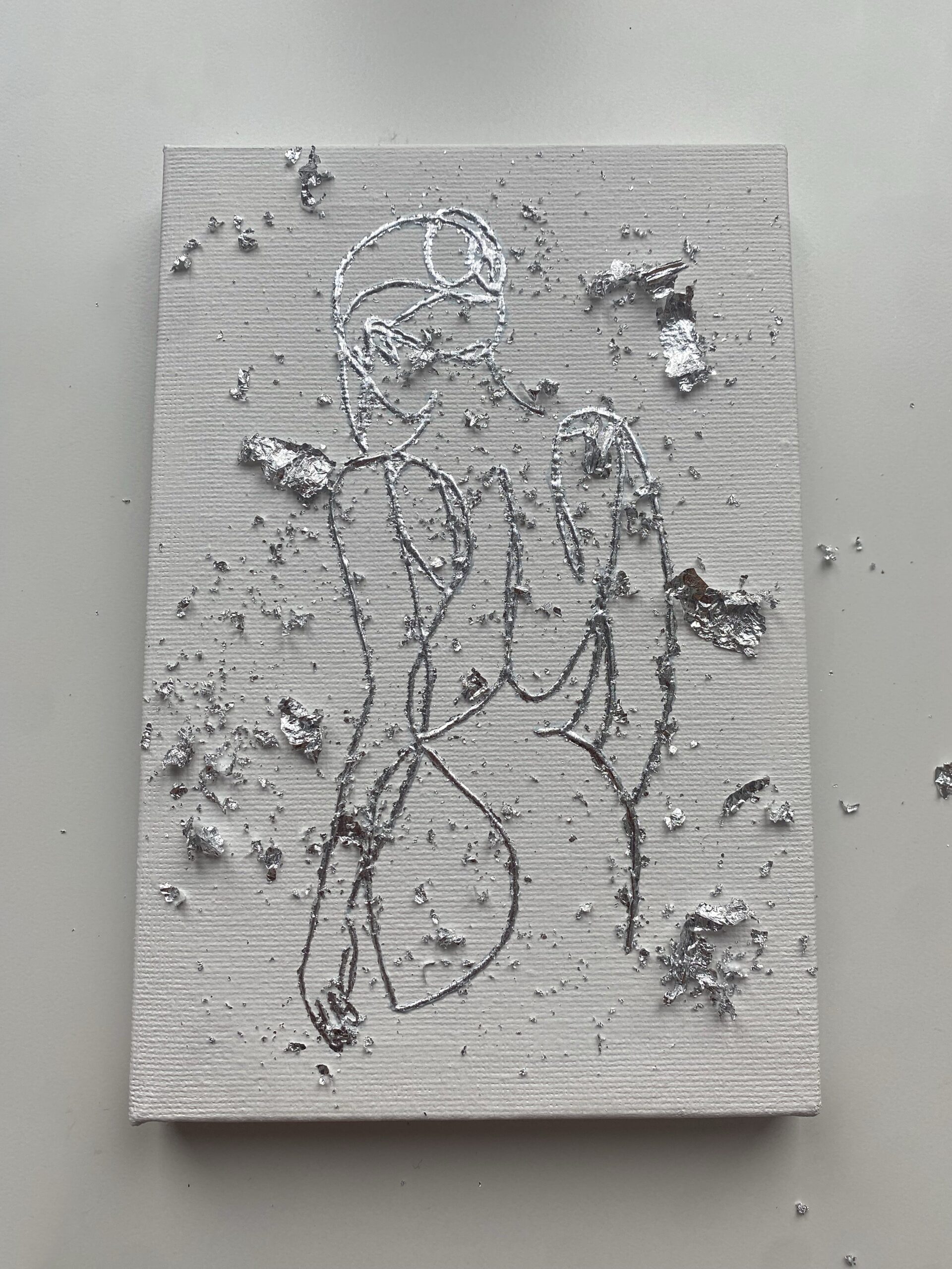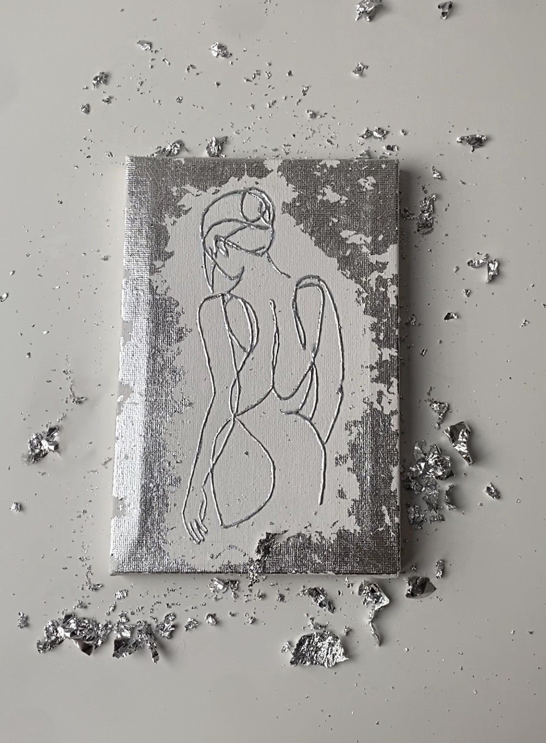 La silueta de una mujer trazada con una sola linea fluida sobre un fondo de plata y acrilico texturado. Una obra minimalista y poetica que habla de la gracia femenina con la elegancia de lo esencial.