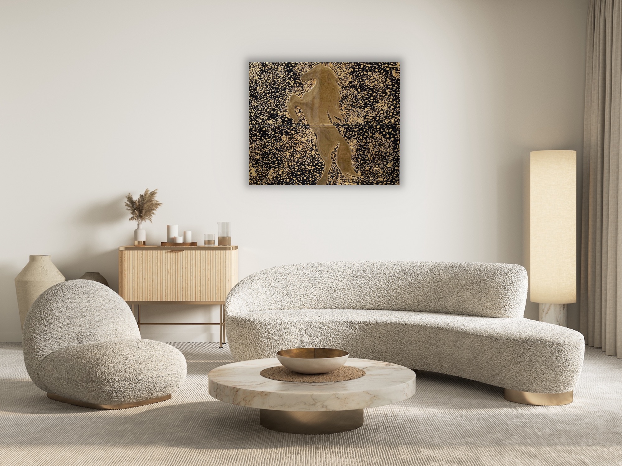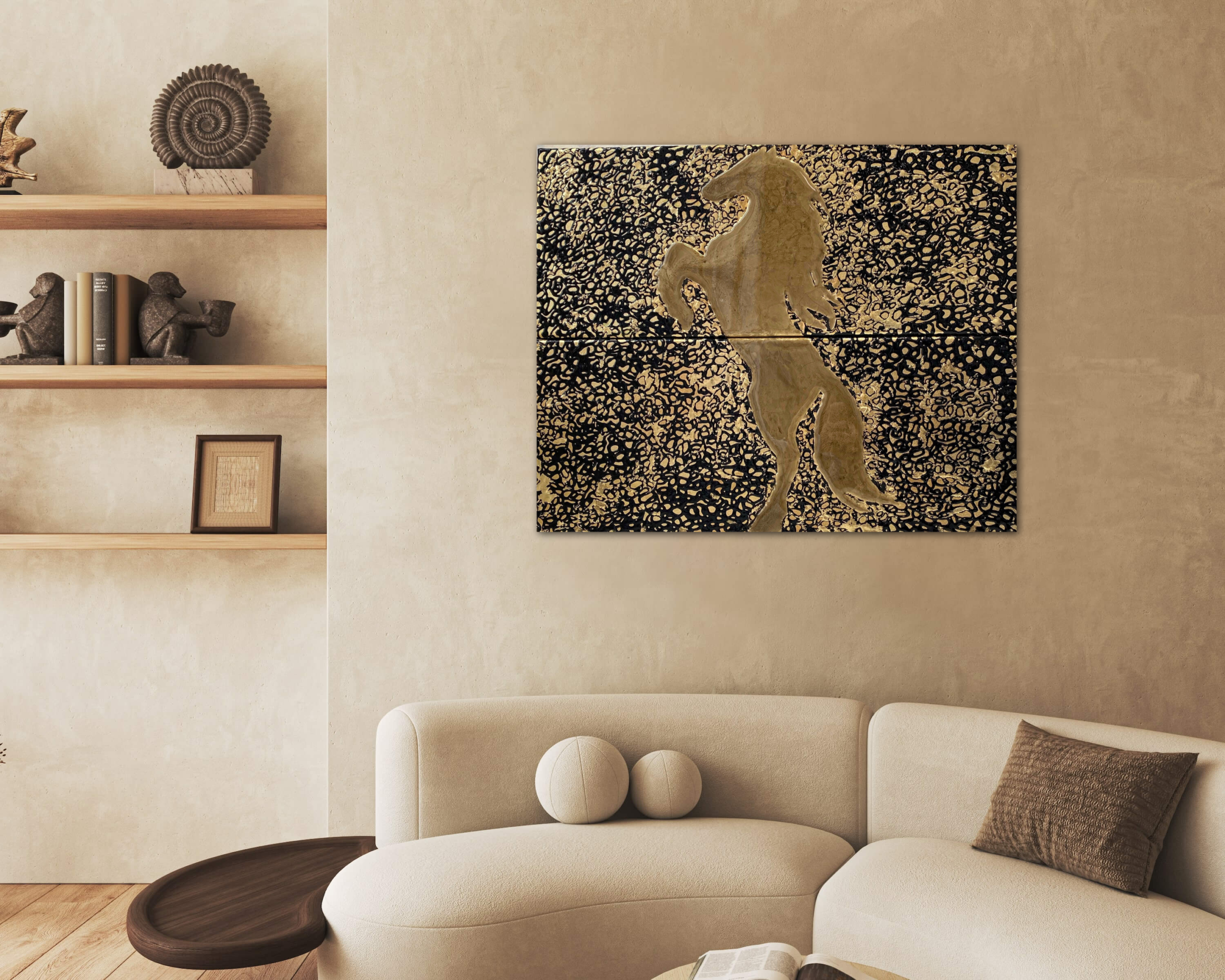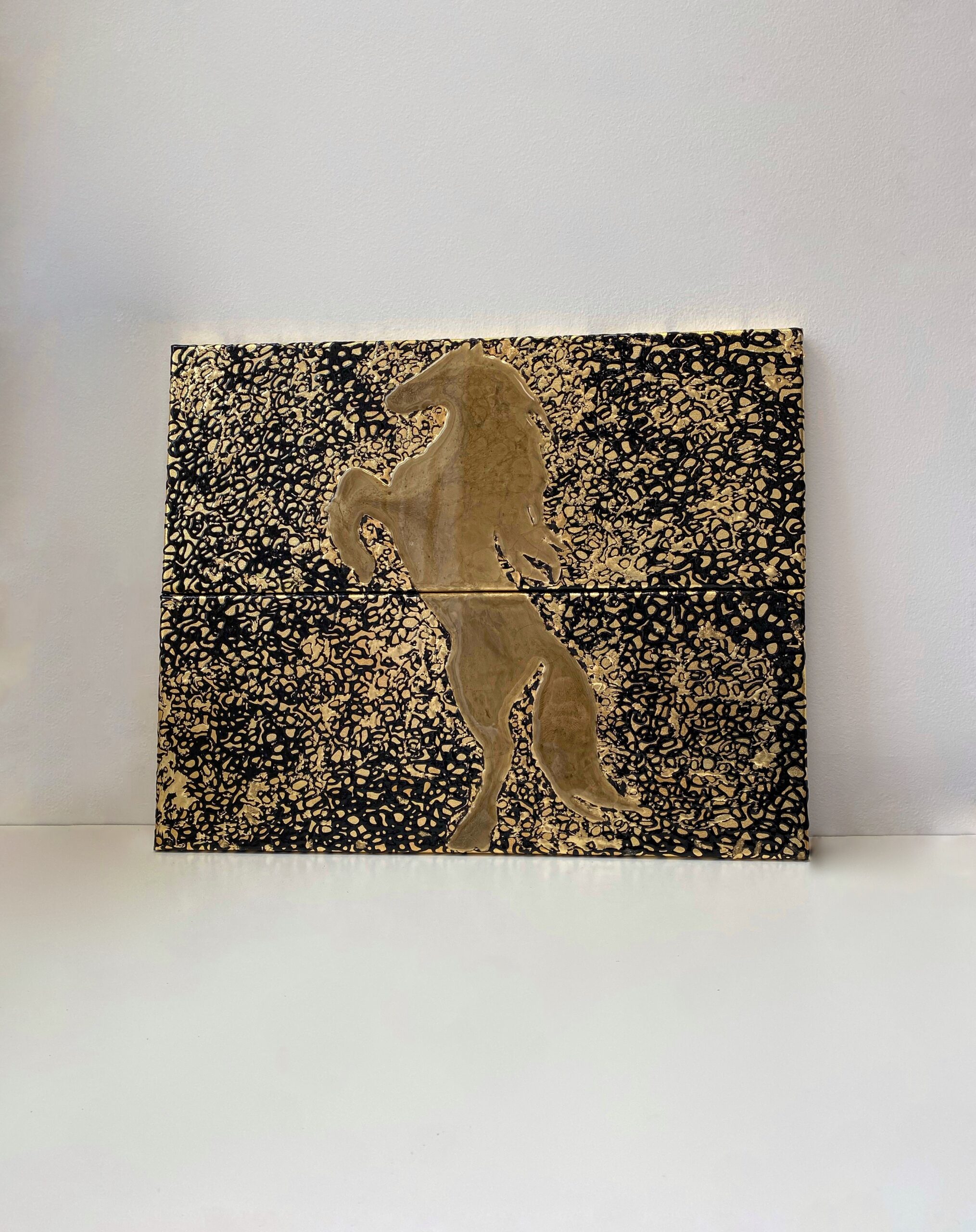La silueta de un caballo encabritado se alza en pan de oro sobre un fondo negro constelado de destellos dorados. Una obra de poder y elegancia que celebra la majestuosidad del animal mas noble.