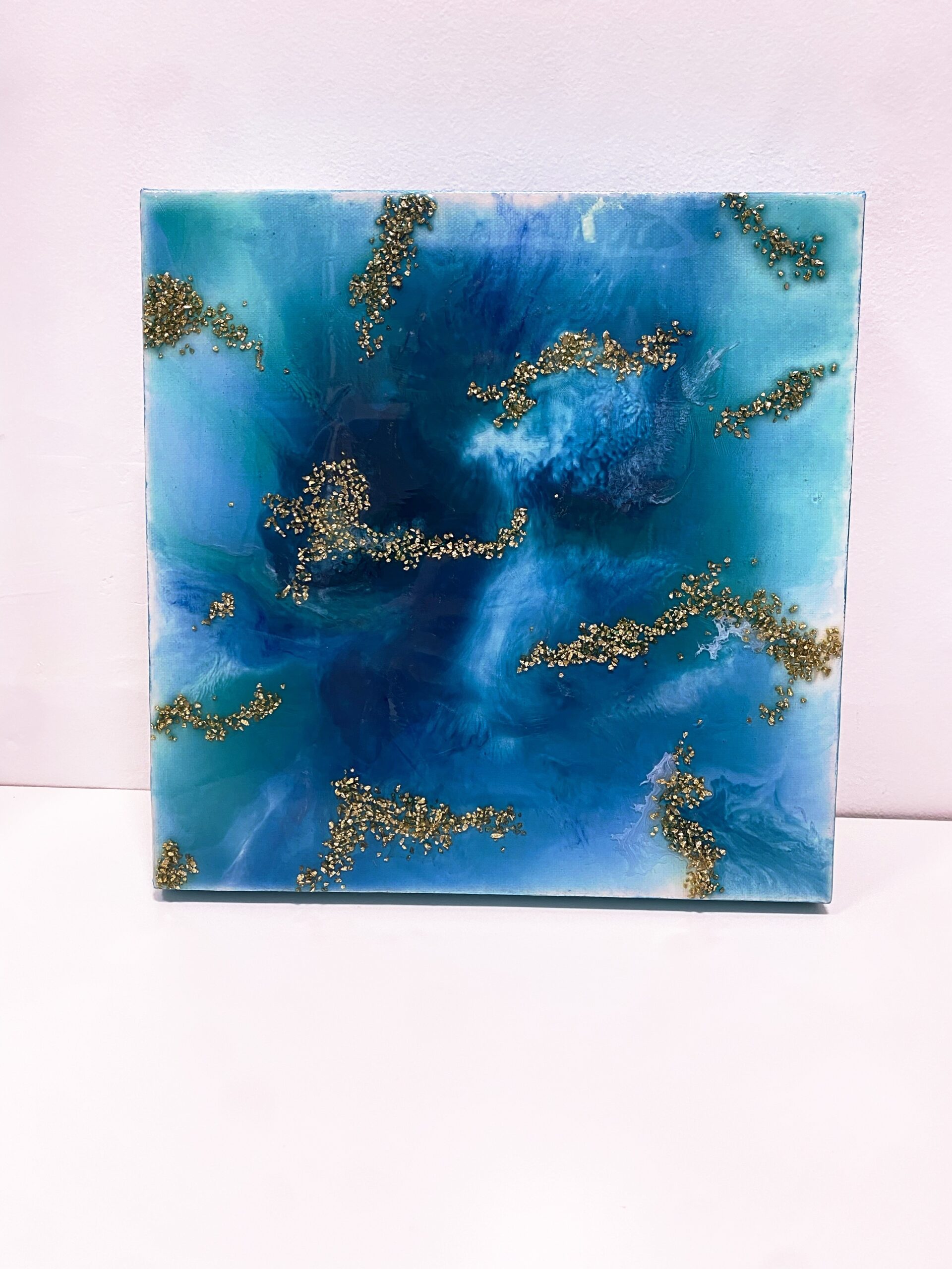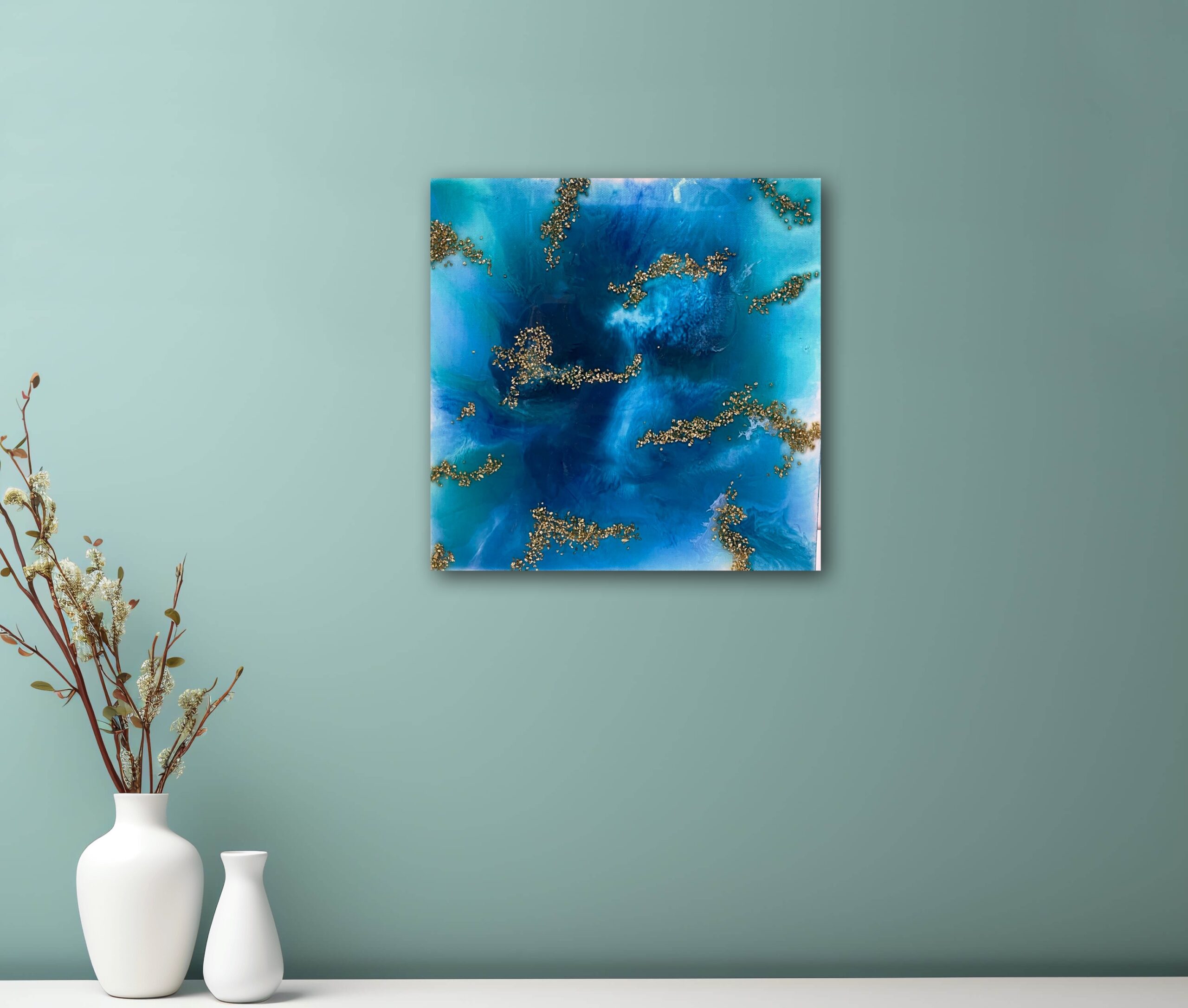 Un viaje al corazon del cielo y el mar. La resina acrilica fluye en tonos de azul profundo y turquesa, salpicada de piedras que evocan constelaciones o corales dorados a la deriva en el eter.