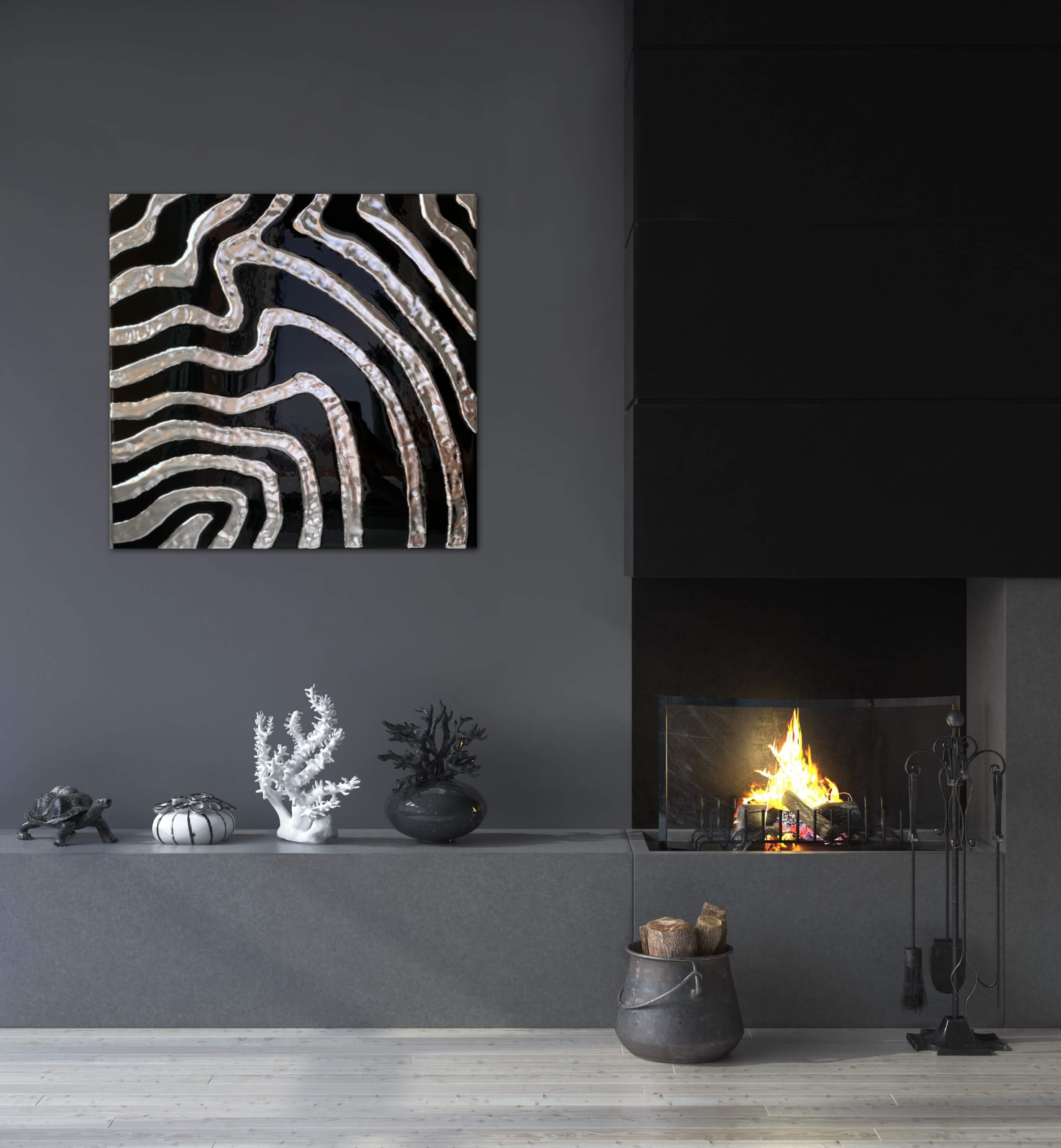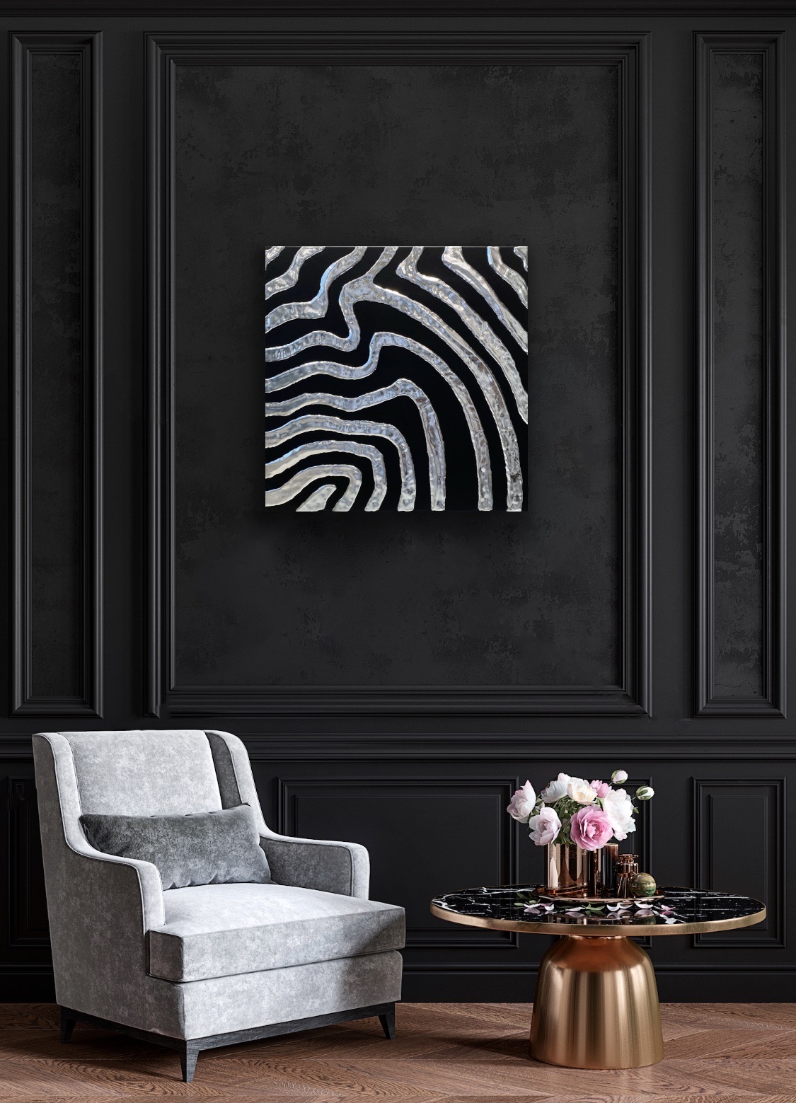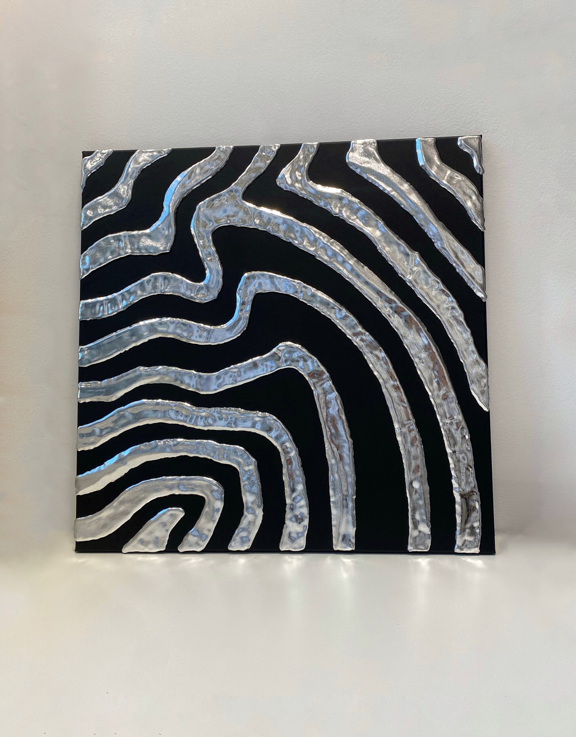 Lineas de silicona plateada recorren el lienzo negro en curvas hipnoticas, evocando las corrientes submarinas de un mar de plata. Una obra de geometria organica donde el fluir nunca se detiene.