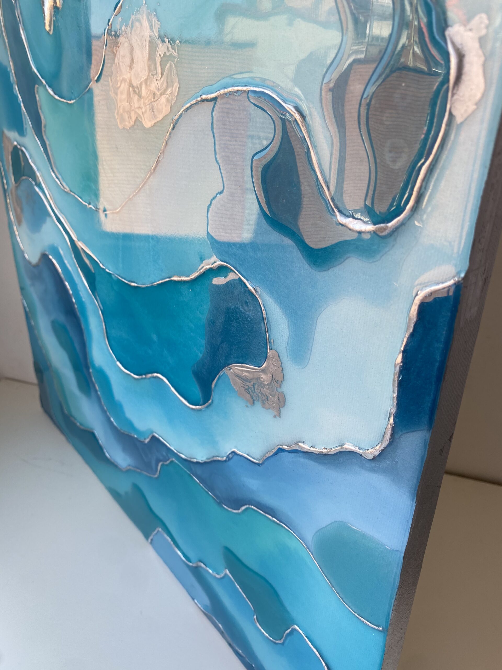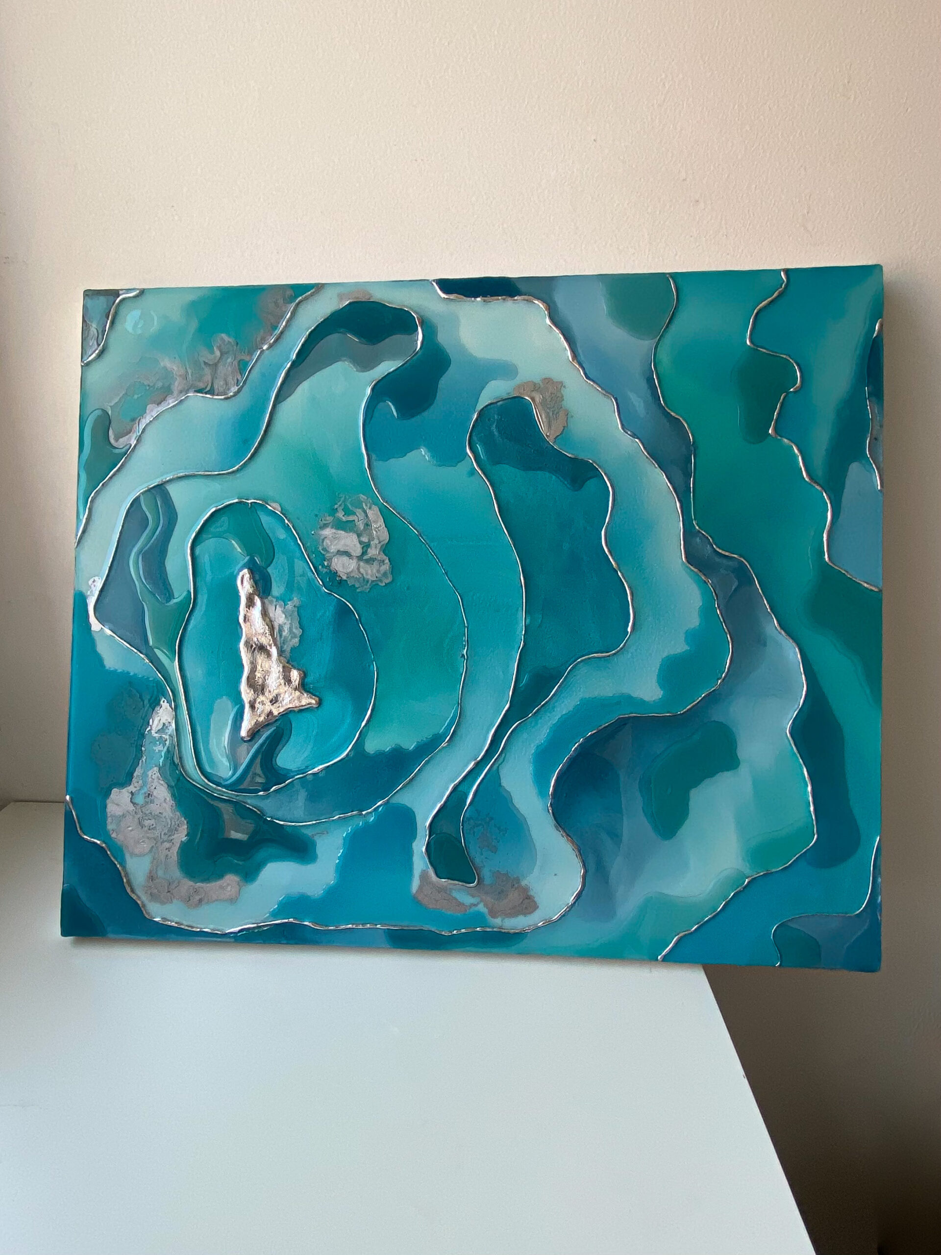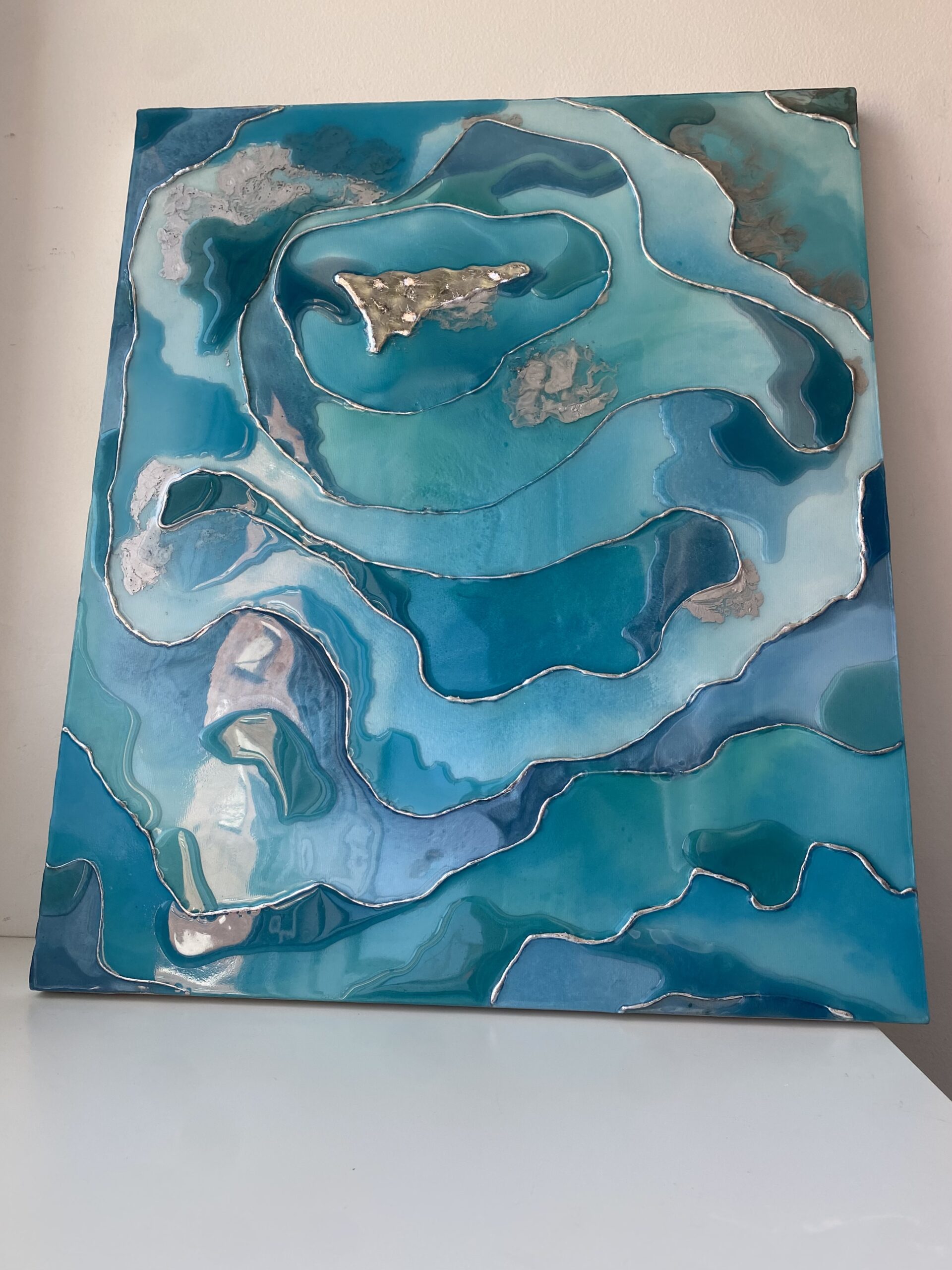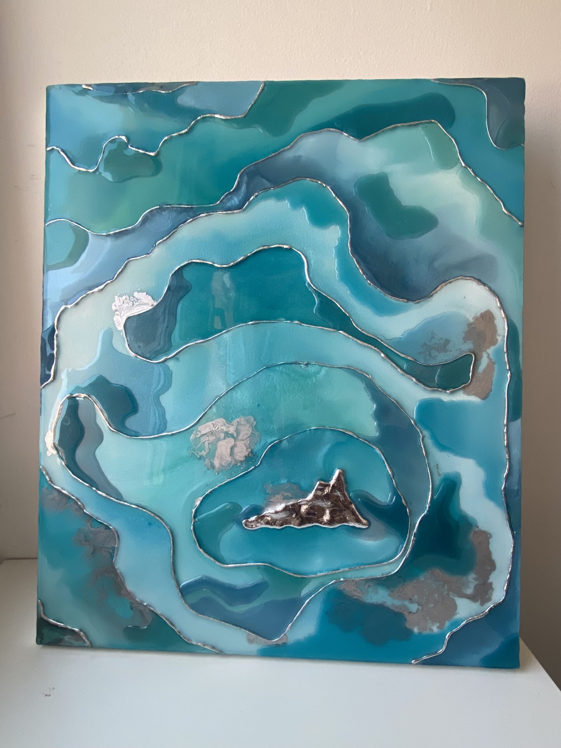 Capas de resina acrilica en verdes y azules forman un oasis de calma, donde ondas concentricas y detalles de pan de plata recrean la serenidad de un remanso de agua rodeado de vida.