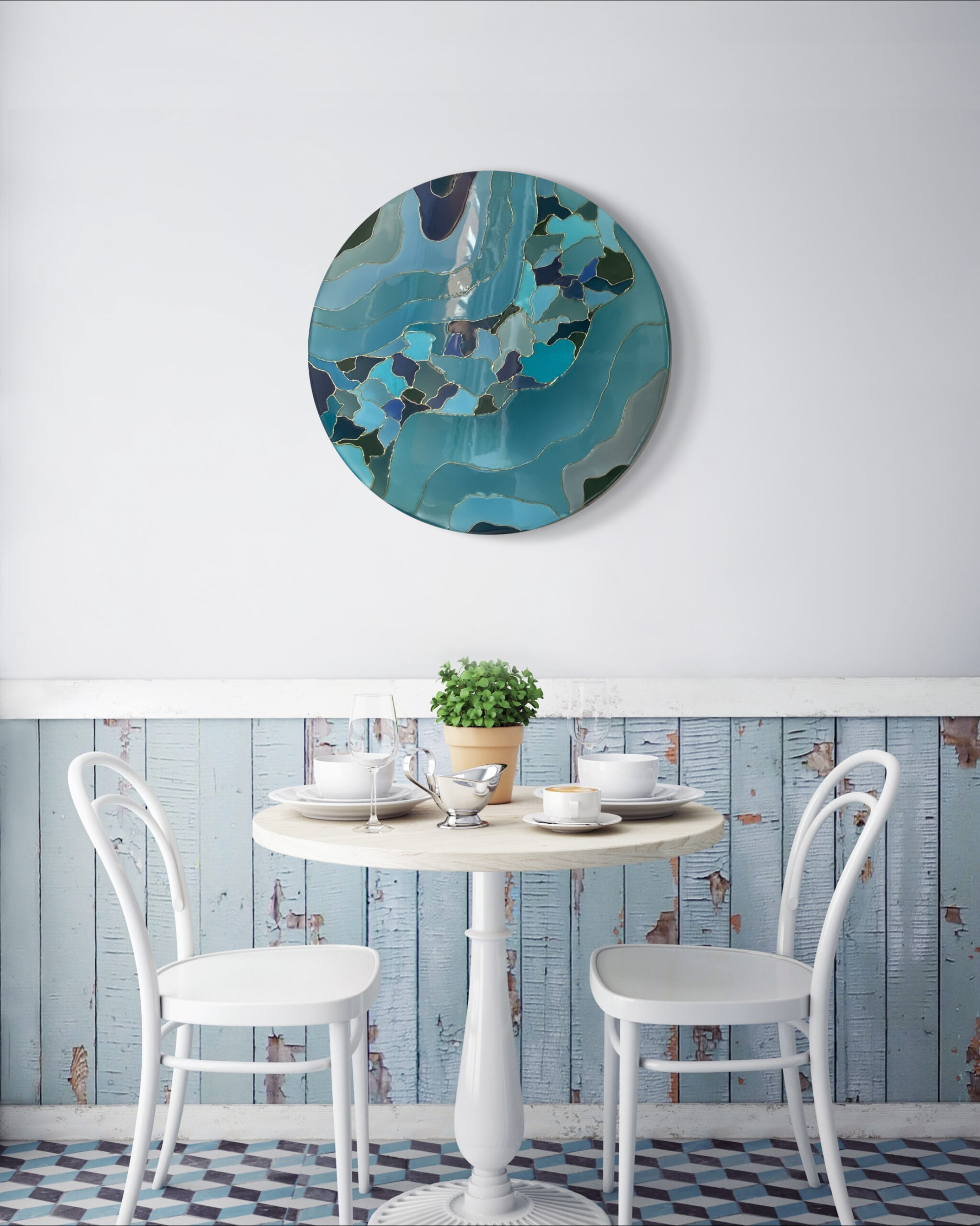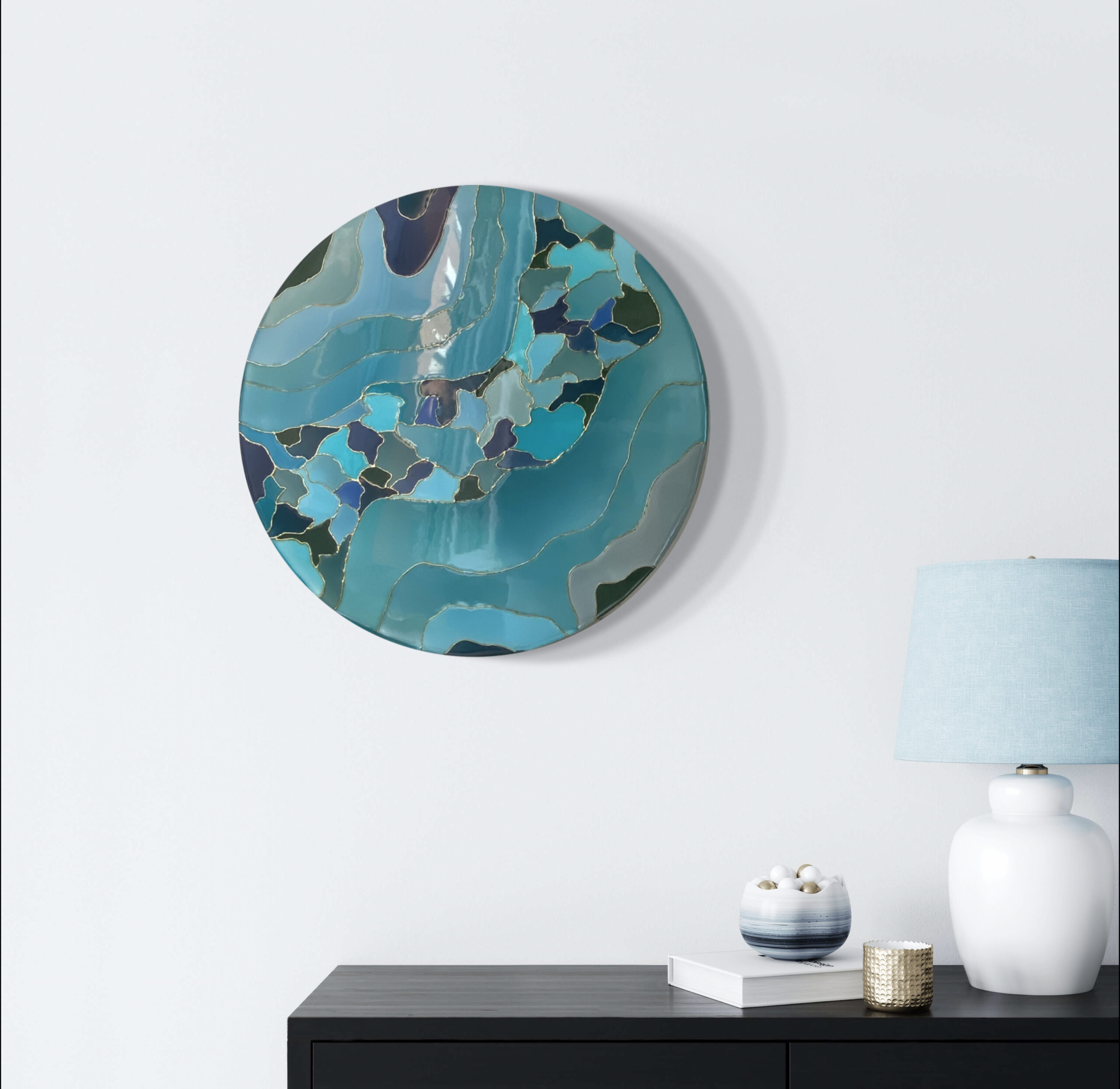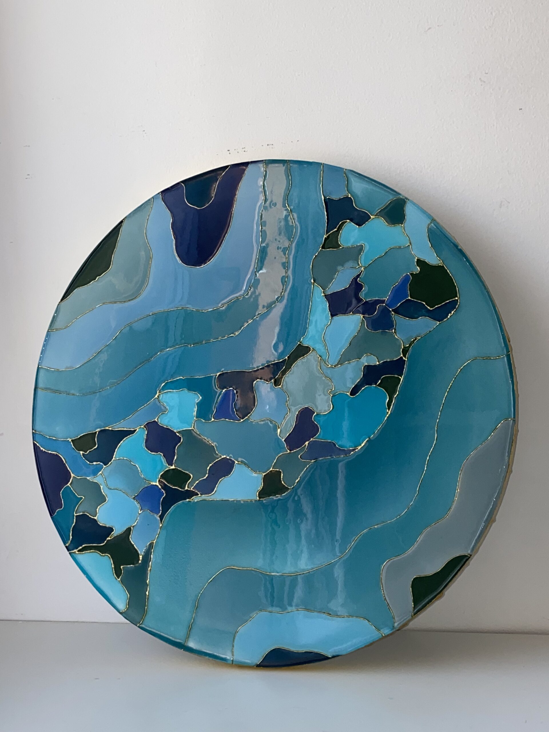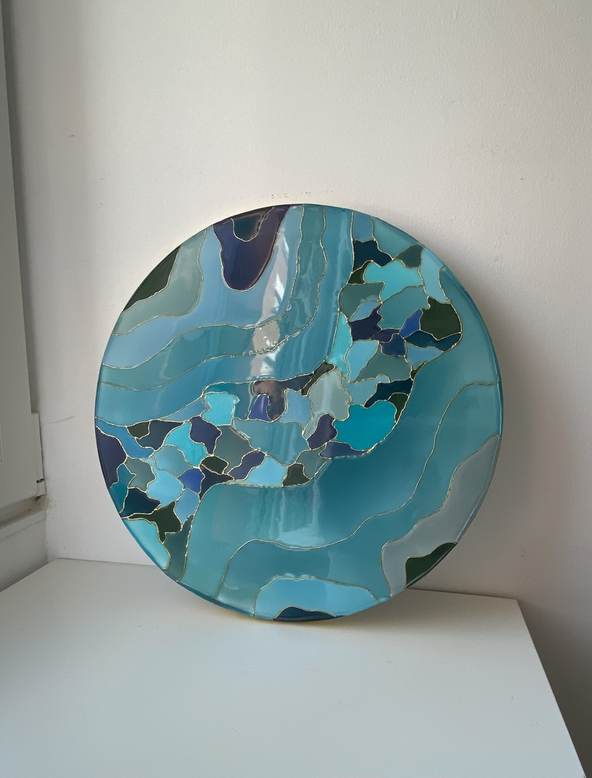 Una pieza circular unica donde fragmentos de resina en miles de azules -indigo, turquesa, celeste- se articulan como un vitral marino. El pan de plata dibuja los bordes de cada pieza, convirtiendo la obra en un mapa de un oceano imaginado.